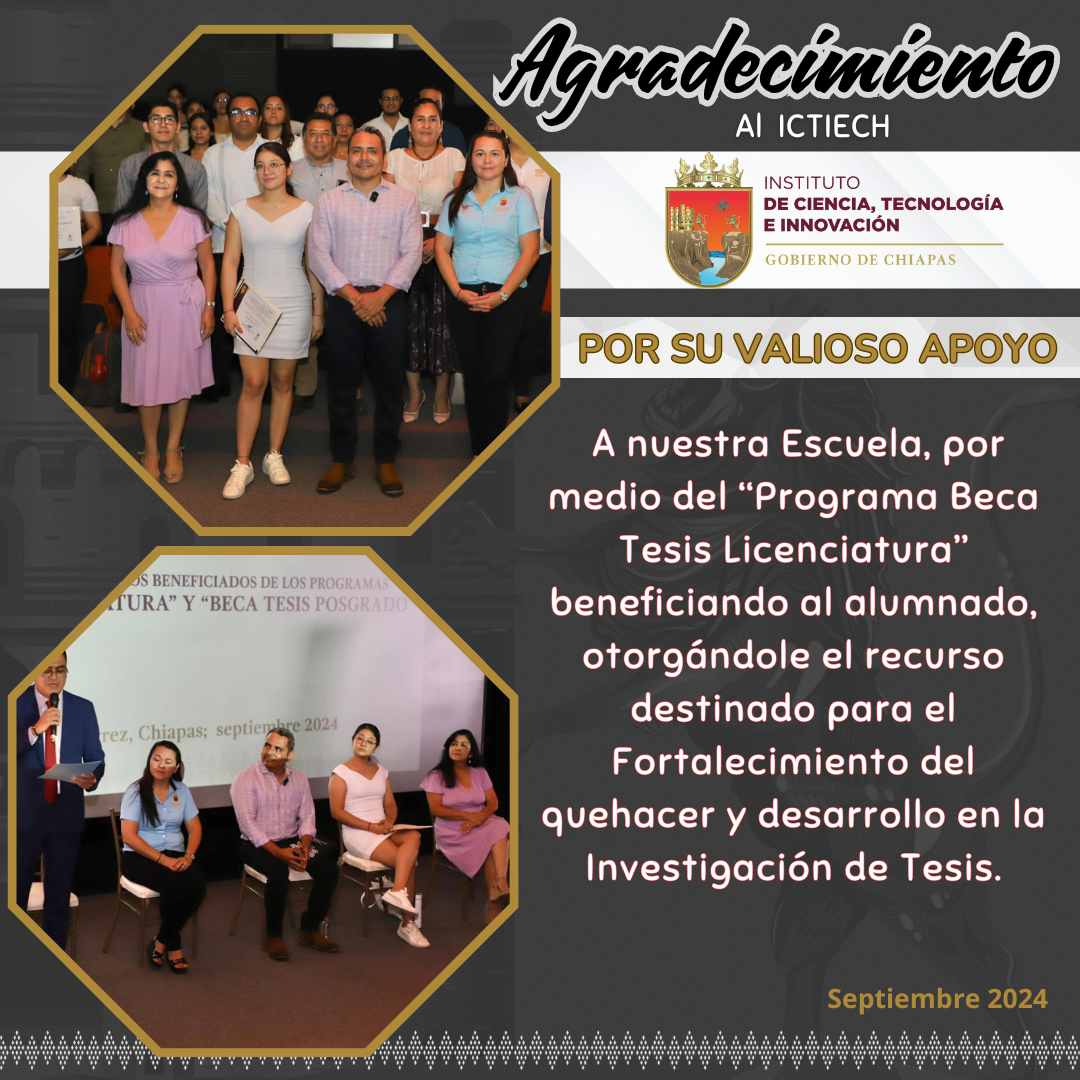La Escuela Normal de Licenciatura en Educación Preescolar "Rosaura Zapata Cano", reconoce ampliamente al Instituto de Ciencia, Tecnología e Innovación de Chiapas (ICTIECH), por su valioso apoyo a la Investigación mediante el programa "BECA TESIS LICENCIATURA".